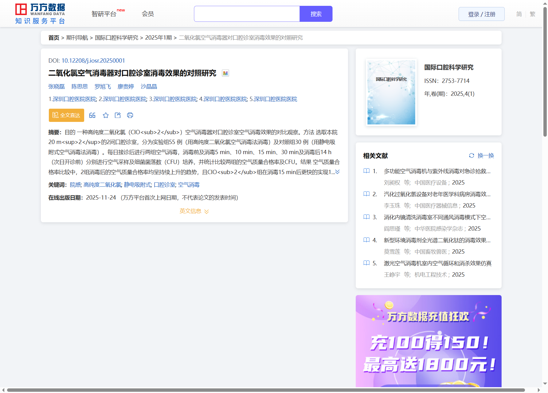 关键词: 院感;高纯度二氧化氯;静电吸附式;口腔诊室;空气消毒